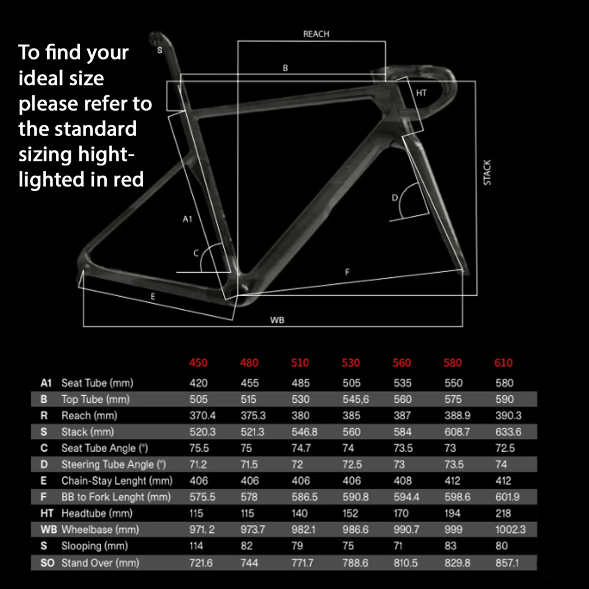 * **precision meets versatility:** seven frame sizes with overlapping ranges to ensure a tailored fit for every rider. High stack and sloping geometry, 25mm shorter seat tube compared to more traditional basso geometry.